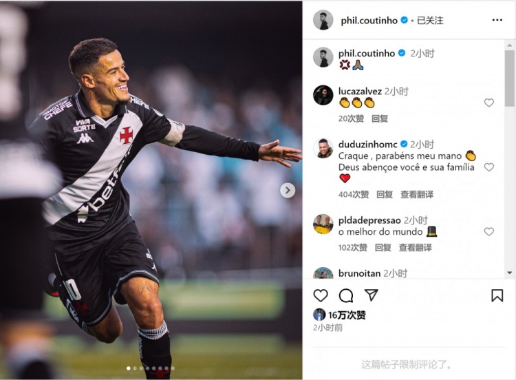 双响助球队大胜!库蒂尼奥社媒晒与内马尔赛场同框照